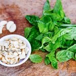 - Transfer the basil leaves, chopped garlic, and cashew nuts to a food processor or a blender.