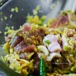 We’ll start by marinating the mutton pieces with green chillies, ginger, garlic and salt. Most of the cooking happens in the pressure cooker. Onions are shallow fried with other ingredients in the pressure cooker. Marinated mutton is added to the mix. All the ingredients are combined well, and then pressure cooked to perfection.