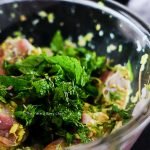 - Once the onions are tender, add sliced green chillies, ginger, garlic, coriander leaves and mint leaves.