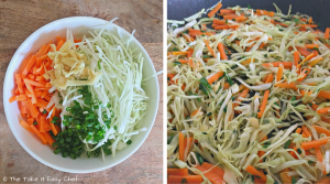 Julienne the carrot, finely shred the cabbage, chop the spring onions and ginger. Heat some oil in a pan, and stir fry the ingredients till tender. Transfer to a bowl, we'll need the pan in the next step.