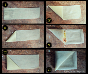 Make a paste adding some water to the flour. We'll use this paste to seal our samosas. (I) Place one samosa wrapper on a flat surface. (II) Fold one end to a triangle. (III) Fold again. (IV) Fold one more time to form a cone. (V) Using a spoon put samosa filling into this cone. (VI) Fold further and seal the samosa casing with the flour paste.