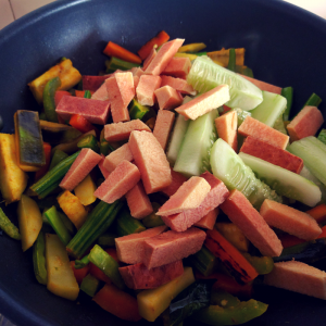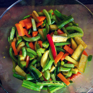 Clean the vegetables and get ready to prep them. Don't be intimidated by the the variety of ingredients. Don't worry about the quantities either. In this recipe, I have used roughly a cup of each vegetable (after cutting).