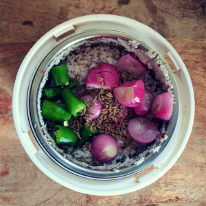 In a mixer, add the grated coconut, remaining green chilies, shallots, and cumin seeds.