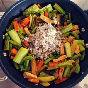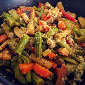 Open the lid, and add the ground coconut mixture to the cooked vegetables.