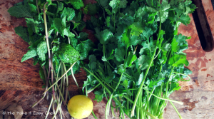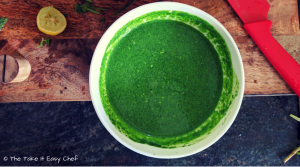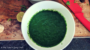 Remove stems, and finely blitz the cilantro and mint leaves in a blender adding 1/4 cup of water, salt and 1/2 teaspoon of lime juice.