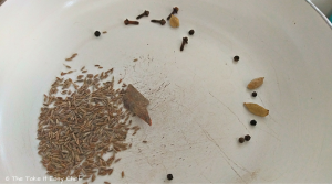 Heat a pan, and dry fry the spices - cumin seeds, cardamom, peppercorns, cinnamon, and cloves. Switch off, and let it cool down.