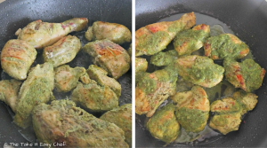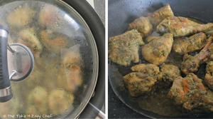 Heat some butter (or oil) in a thick-bottomed pan. Let's start by searing the chicken. Fry to get a nice, light-brown colour. Now add the remaining marinade that we had kept aside.