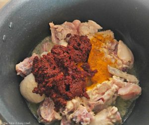 Heat some oil in a deep-bottom pot, and fry the chicken pieces for a couple of minutes.