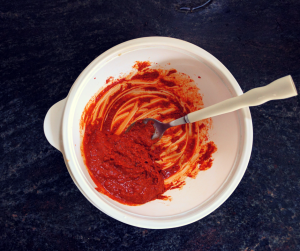 Add 1 tablespoon vinegar and mix well. Add water, a little at a time, while mixing until you get the consistency of a marinade.
