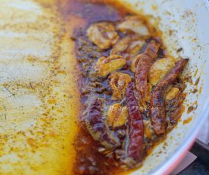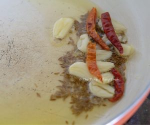 Crush the garlic cloves with the back of a knife, or your palm, and add to the pan. If we slice the garlic, they'll get lost in the gravy. Lower the flame and add the dry red chillies as well.