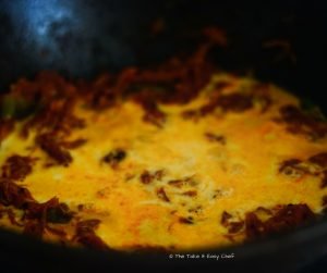 Cook until the tomatoes are mushy and disappear into the onion mix. Add turmeric powder, Kashmiri chilli powder and coriander powder.