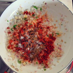 Add the chopped onions and cook till they are tender. Add green chili, chili powder, and turmeric powder, and continue frying for a few more minutes while stirring.