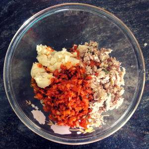 Take all the ingredients in a bowl - the mashed potato, fish flakes, and the fried onions. Mashed potato should be double the amount of the prepped fish.