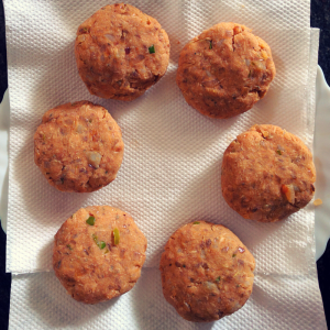 I used less oil and shallow-fried the cutlets. You can add more oil and deep fry them. Take care not to burn them. I fried them in batches, three at a time. The fish cutlets are delicate, and you need to be careful not to break them while handling them.