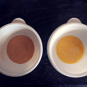 Beat one egg in a bowl. Take the breadcrumbs in another one.