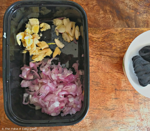 Prep the ingredients - chop the ginger and garlic cloves, and crush them, thinly slice the shallots.