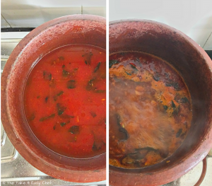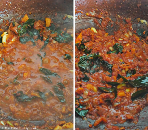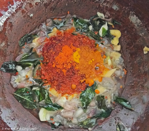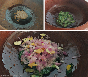 In a pan or pot, heat some oil. I used a traditional clay pot (man chatti) for an authentic flavour. Splutter fenugreek seeds, followed by curry leaves, and ginger, garlic and shallots.