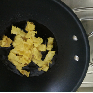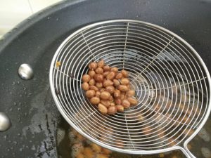 Fry the groundnuts in the oil until they turn golden brown. Drain and place them in the tray.
