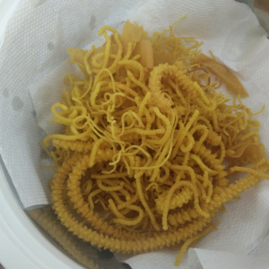 Drain the fried sev with a colander, and place them in a tray lined with kitchen towels to absorb any excess oil.