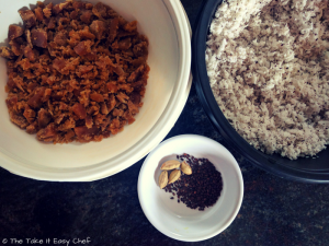 Get the ingredients ready. For grated jaggery, I chipped a block of jaggery to small pieces.