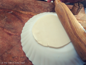 Apply a little ghee or oil and grease the back of a plate. Wet your palms, take one of the dough balls and roll it to a palm sized disk. Tip: If you add a little more ghee in the dough and while rolling, you'll be able to get a much thinner, smoother disks.