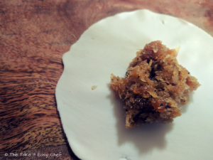 Take a heaped teaspoon (ideally 1/10th of the mix) of the modak mix and place it on the rice flour disk.