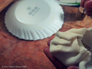 Take the rice disk on your hand, and slowly fold around the modak mix to form a dumpling.