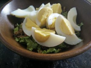 Peel the boiled eggs, and slice them lengthwise into four pieces. Add the eggs to the bowl.