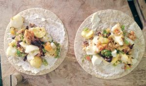 Take two tortillas and spread some cream cheese on them. Note: Adding cream cheese is optional. Your wrap will taste great even without it. I used chapatis instead of tortillas. Add half of the wrap filling on each tortilla.