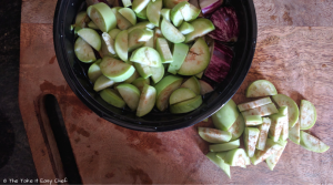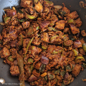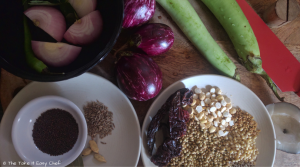 Cut the eggplants (brinjal) to small pieces. Only the green variants of eggplant are used in the traditional recipes. I, however, used both green and purple varieties to get a good balance of colours!