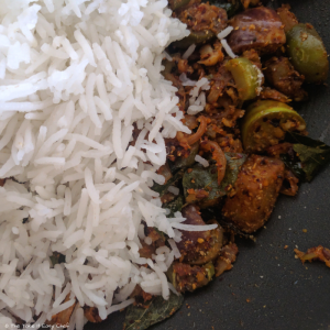 Vangi Bath (Eggplant / Aubergine / Baigan Rice), is a popular rice-based delicacy from the Karnataka cuisine, where small pieces of aubergine is cooked with select spices (vangi bath masala), and mixed with rice making it a meal in itself.