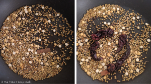 Heat a pan, and dry fry the vangi bath mix ingredients. I usually add dry chillies after the other ingredients turn golden brown. Dry chillies might burn if you add them in the beginning.
