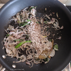 Add onions, curry leaves, and green chillies. You can add some grated dry coconut (copra) at this stage (Optional).