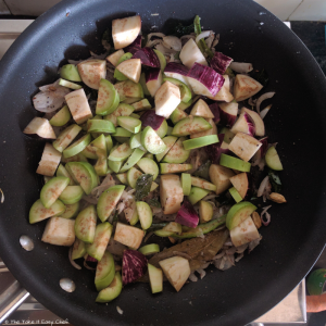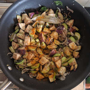 Once the onions are tender, add the eggplant pieces.