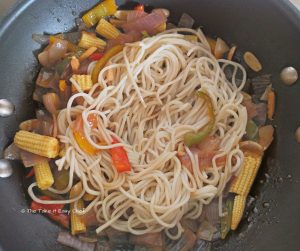 Add the cooked noodles, and gently stir until they are evenly coated with baby corn mix.