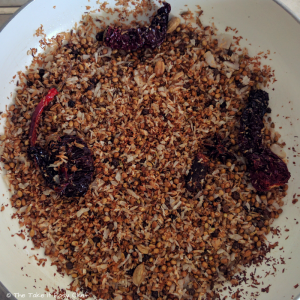 Once you have an evenly ground mixture, add 1/4 cup water and blend well.