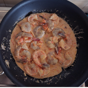 Add prawns, slowly stir and coat them with the creamy tomato sauce. Simmer with the lid closed for 3 minutes (not shown in pictures). Open the lid and cook for another 2 minutes to reduce the sauce. Medium sized prawns will get cooked in 3-4 minutes. If you are using larger varieties, cook for an extra couple of minutes. Prawns turn pink when they are cooked.
