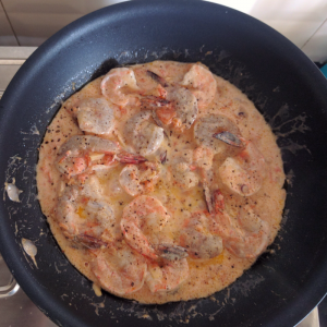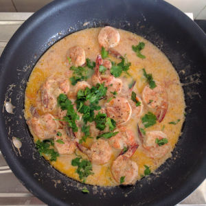 Tasty prawns (shrimps) with warm aroma of ginger, with mellow richness of silky cream, mild fieriness from chilies and black pepper, all topped up with fresh coriander leaves - pure bliss!