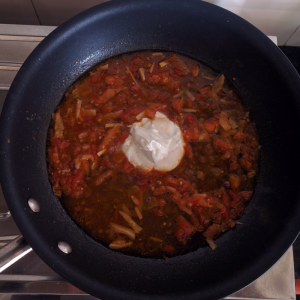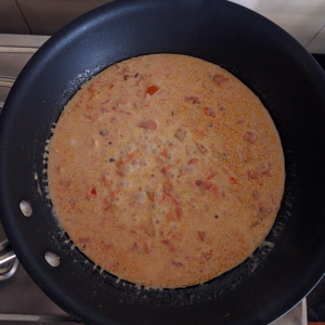 Stir well, and blend the cream into the tomato sauce. This is the base of our dish.