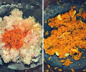 Heat one tablespoon olive oil in a clay pot. Add grated onions, and the remaining spice mix. Mix well and cook for 5 minutes on a medium flame stirring frequently. Add garlic (crush them with your palm or the flat side of a knife) and cook for another 5 minutes on a low flame.