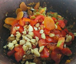 Add dry fruits and chopped tomatoes to the pot.