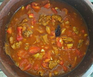 Use the tomato juice to deglaze the pan in which we fried the lamb pieces, and add it to the cooking pot. Add salt, honey, mix well, and bring to boil on a high flame. Now reduce to a low flame, close the lid, and slow cook for an hour. Open the lid and stir occasionally. The lamb pieces should be cooked to tender, that they start to fall off from the bone. Cook further for enhanced flavours.