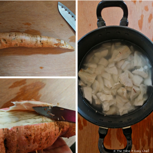 Wash the tapioca, score along the surface using a sharp knife, and peel the skin off. Discard the skin, and cut the tapioca into small 1-2 inch pieces. Place them in a pot, and pour water keeping the level about an inch above the tapioca pieces.