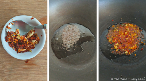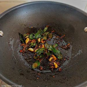 Using a mortar and pestle, crush the garlic cloves, and mix well with the crushed dry chillies. Heat oil in a pan, and splutter mustard seeds. Add the garlic-chilli mix, and fry for a few seconds.
